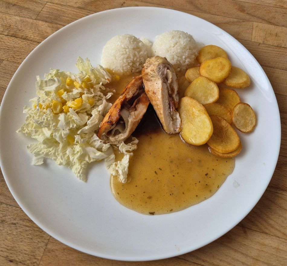 Kuracia kapsa plnená anglickou slaninkou a sušenou paradajkou,ryža,zemiakové plátky,šalát z čínskej kapusty a kukurice