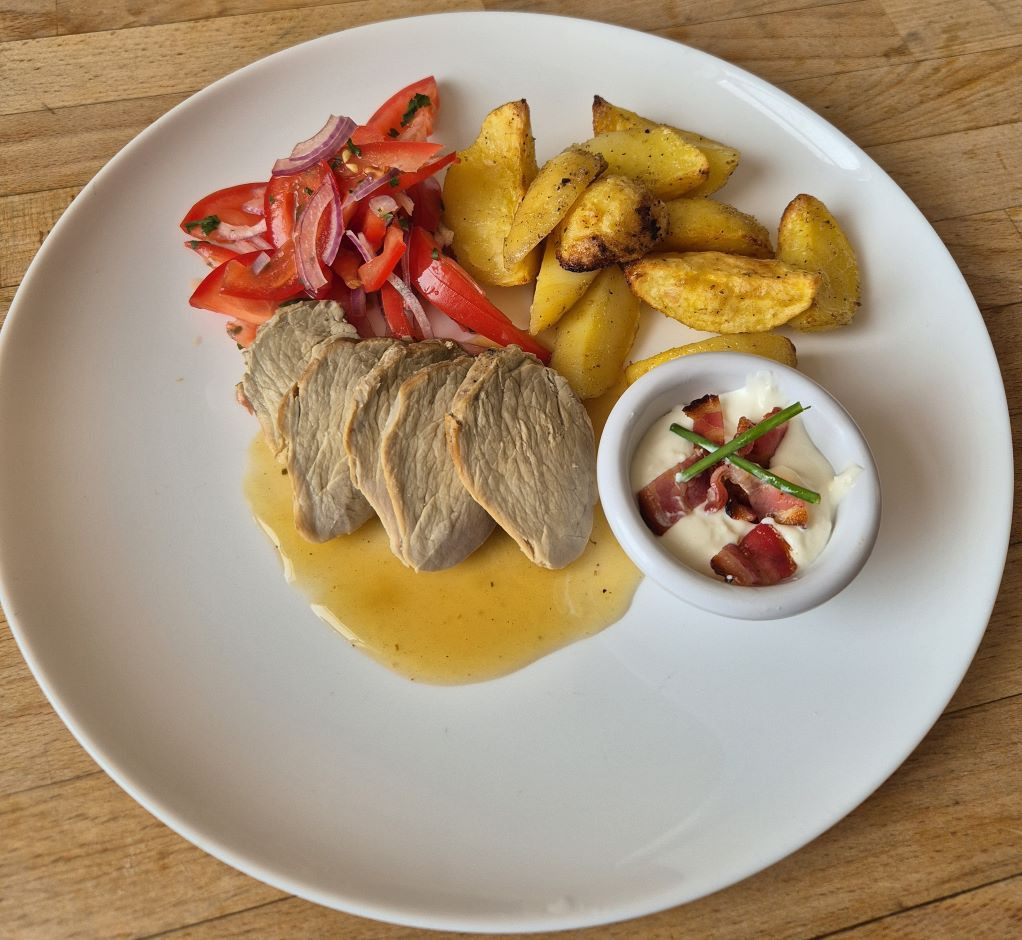 Kuracie mäso na prírodnej omáčke,pučené zemiaky so slaninou a cibuľkou,paradajkový šalát