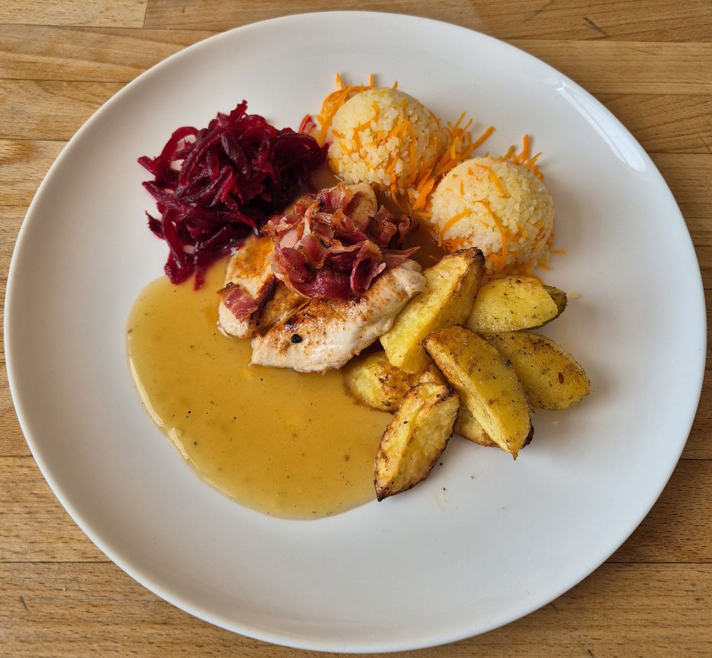 Kuracie so slaninkou,mrkvová ryža,opekané zemiaky,cvikla
