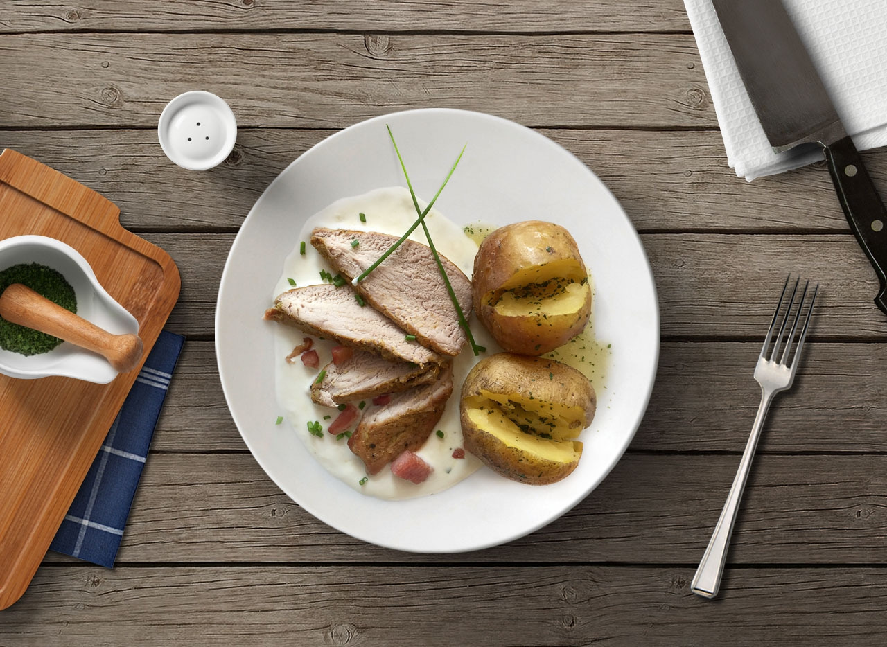 Panenka s bryndzovou omáčkou a kúskami slaninky, zemiak v šupke s bylinkovým maslom