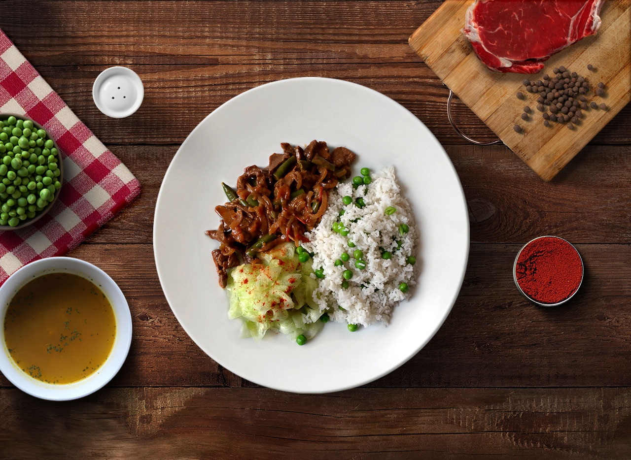 Hovädzie soté na šapiňónoch, hrášková ryža a uhorkový šalát
